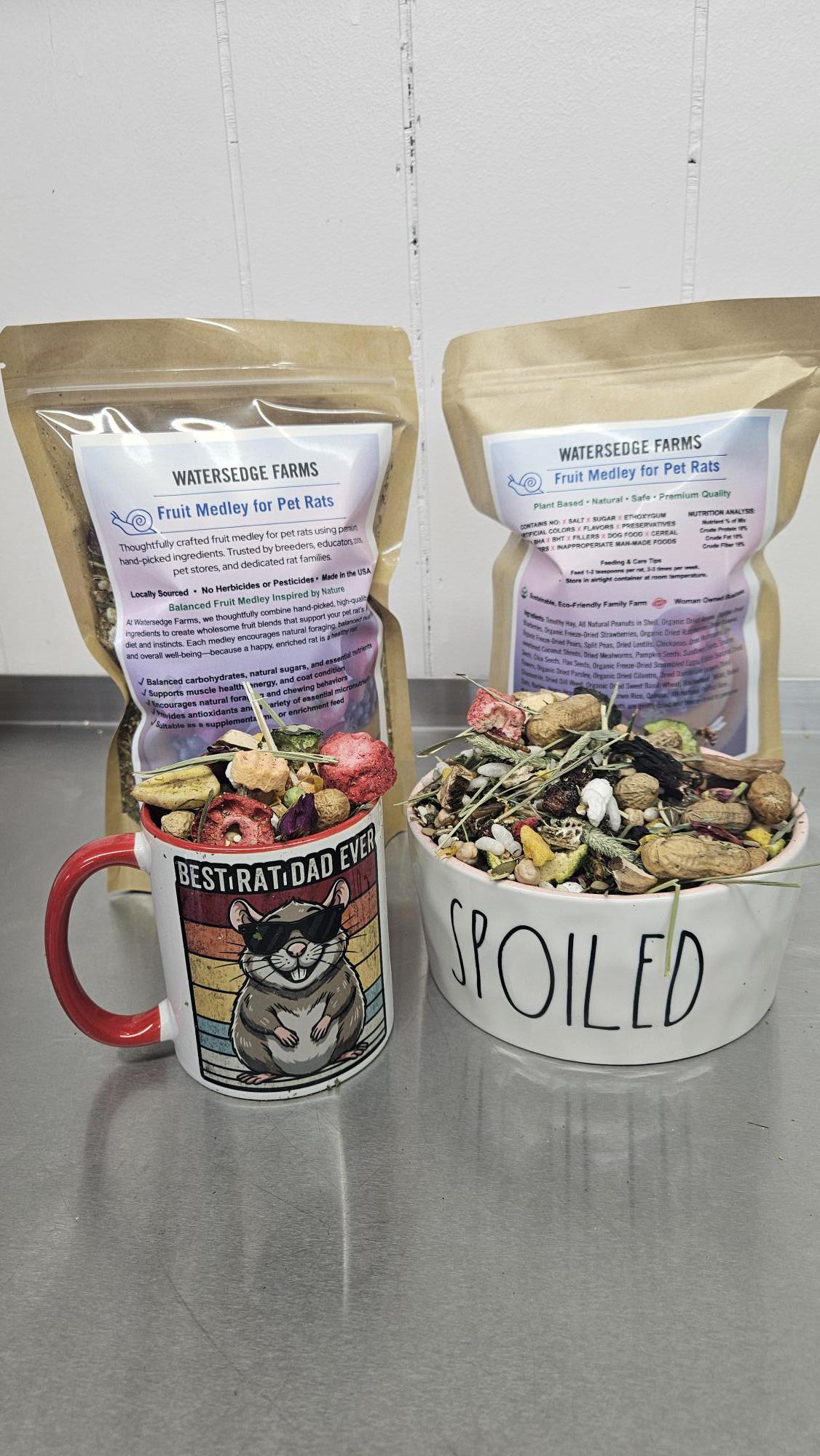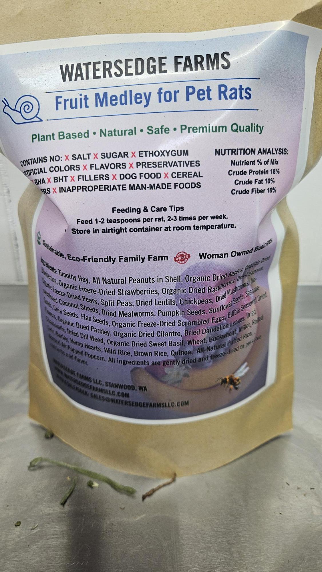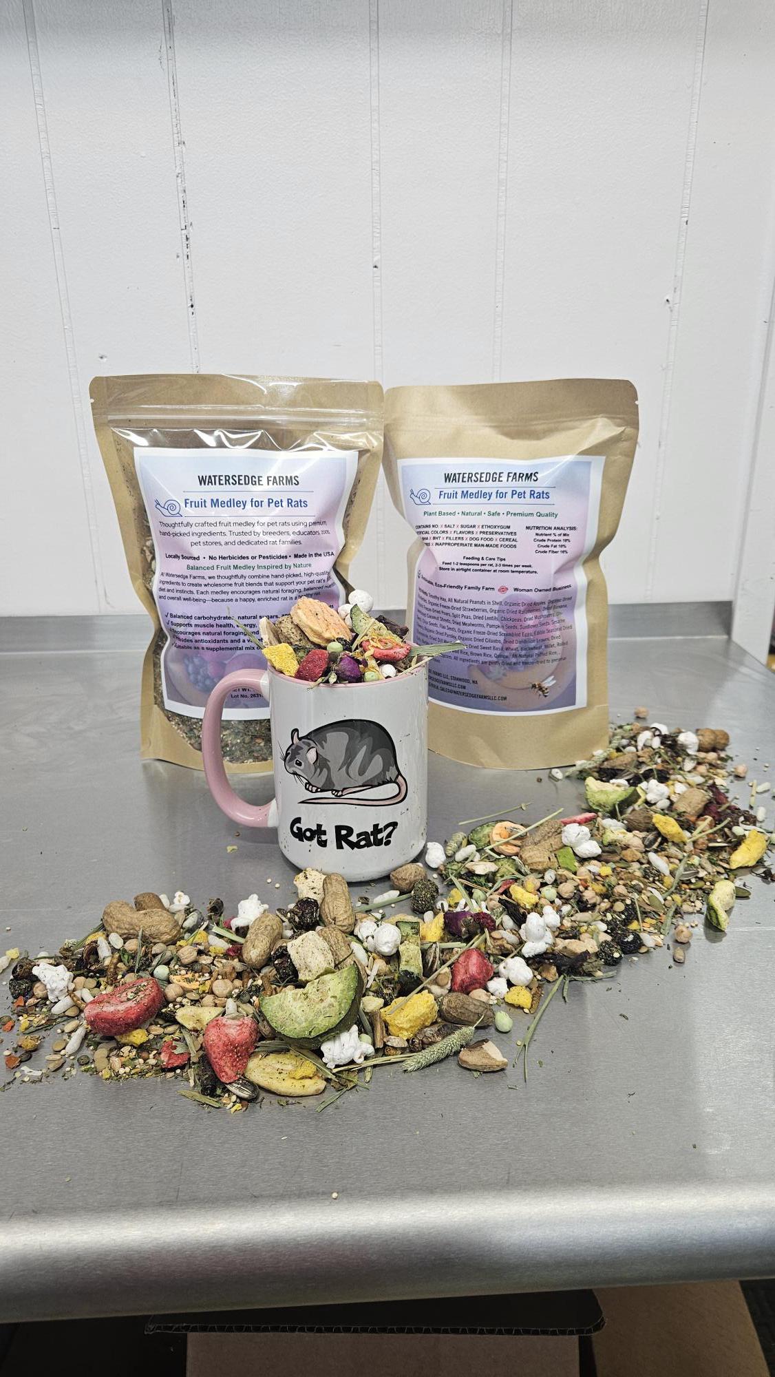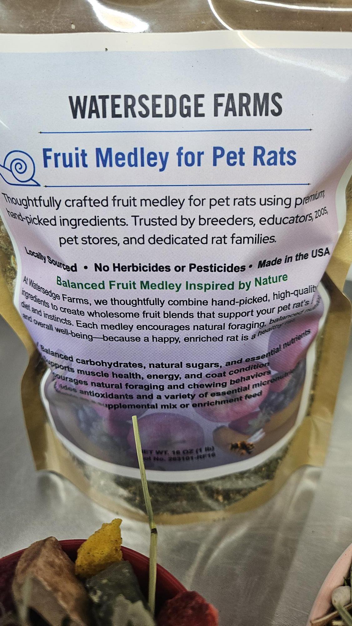 At Watersedge Farms, we thoughtfully combine hand-picked, high-quality ingredients to create wholesome fruit blends that support your pet rat’s natural diet and instincts. Each medley encourages natural foraging, balanced nutrition, and overall well-being—because a happy, enriched rat is a healthy rat.