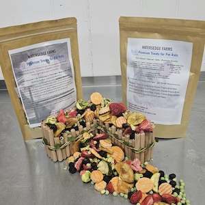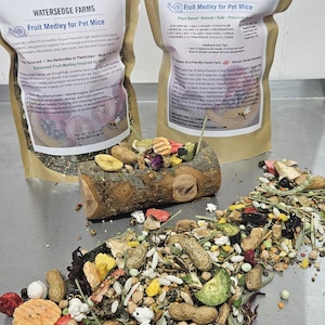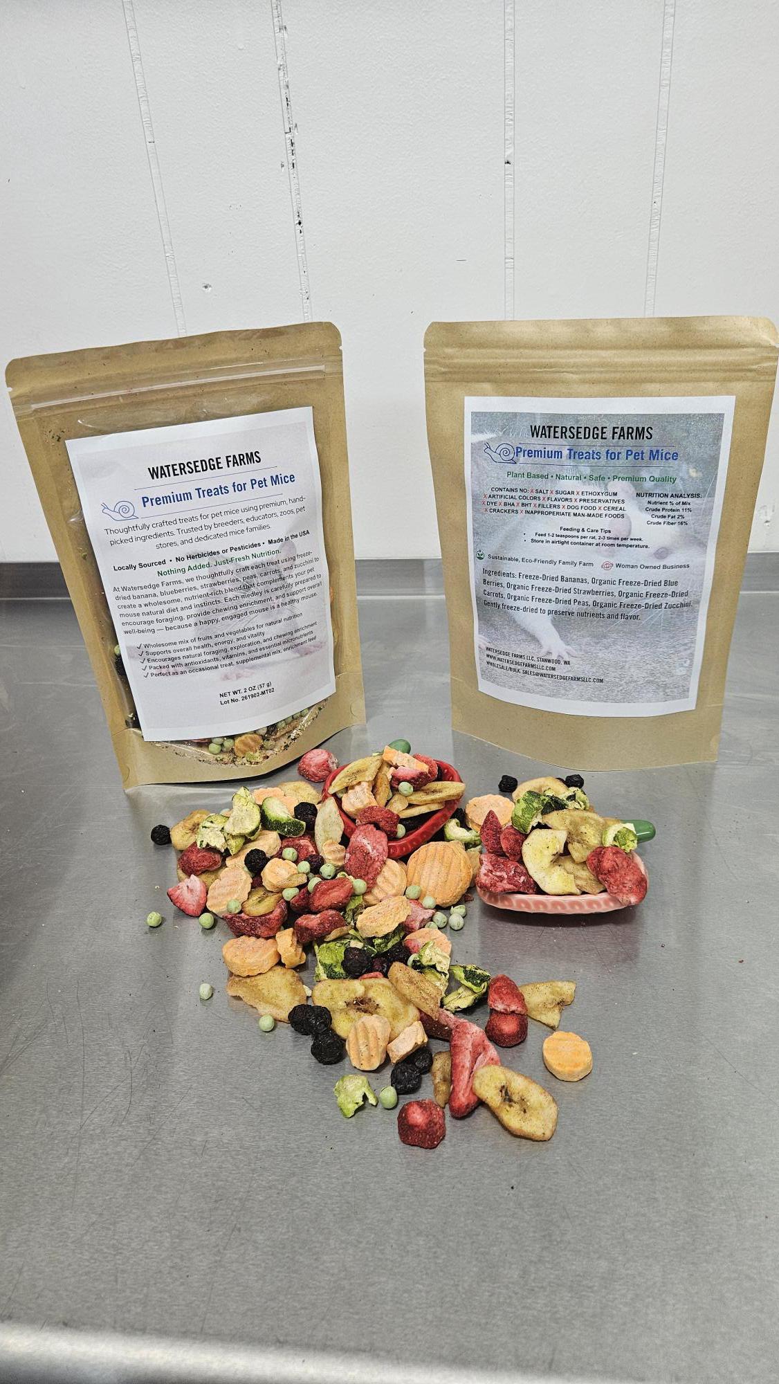 At Watersedge Farms, we thoughtfully craft each treat using freeze-dried banana, blueberries, strawberries, peas, carrots, and zucchini to create a wholesome, nutrient-rich blend that complements your pet mouse natural diet and instincts. Each medley is carefully prepared to encourage foraging, provide chewing enrichment, and support overall well-being — because a happy, engaged mouse is a healthy mouse.