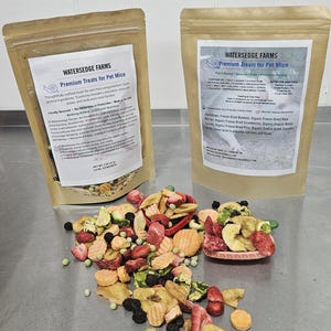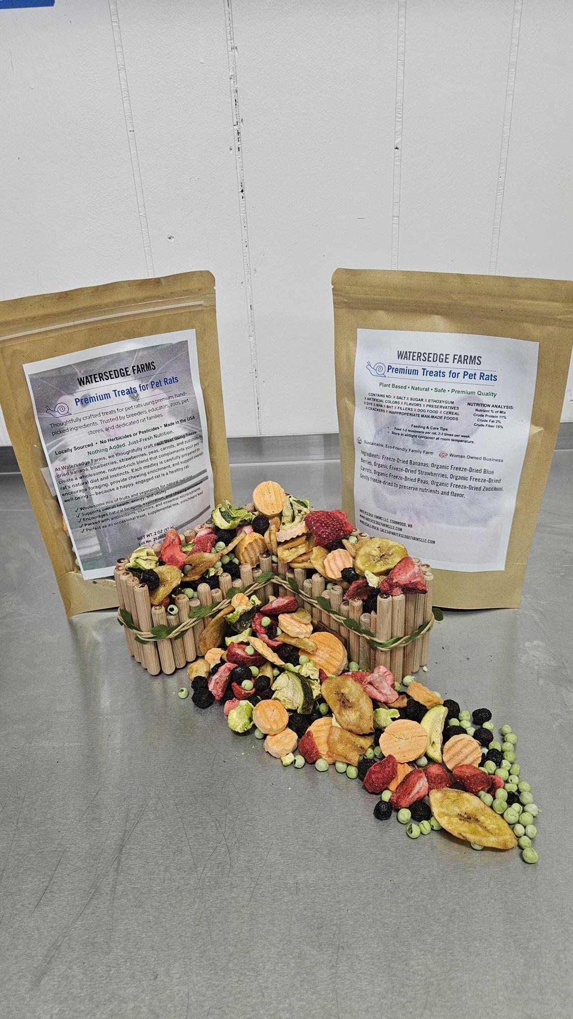 At Watersedge Farms, we thoughtfully craft each treat using freeze-dried banana, blueberries, strawberries, peas, carrots, and zucchini to create a wholesome, nutrient-rich blend that complements your pet rat's natural diet and instincts. Each medley is carefully prepared to encourage foraging, provide chewing enrichment, and support overall well-being — because a happy, engaged rat is a healthy rat.