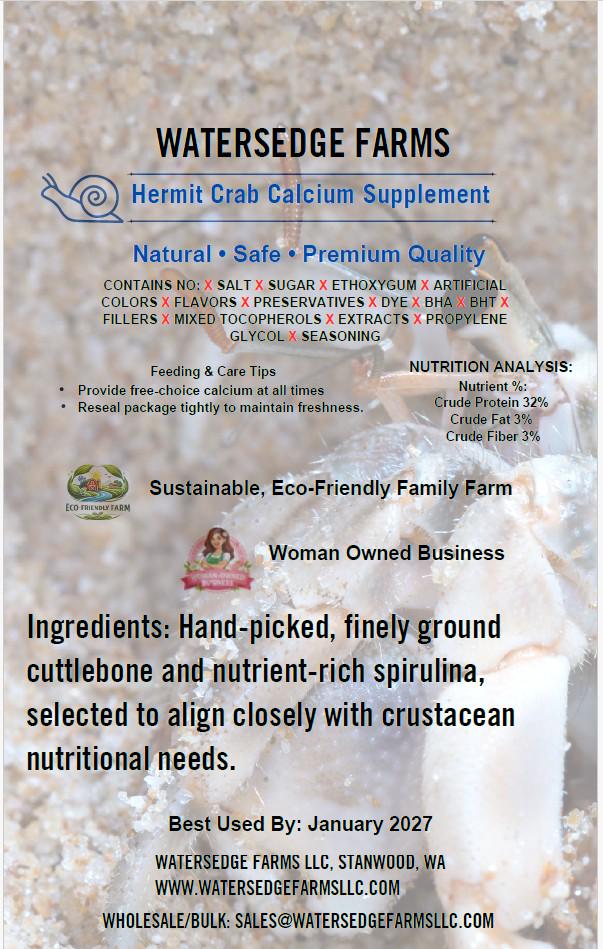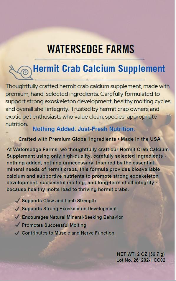 At Watersedge Farms, we thoughtfully craft our Hermit Crab Calcium Supplement using only high-quality, carefully selected ingredients - nothing added, nothing unnecessary. Inspired by the essential mineral needs of hermit crabs, this formula provides bioavailable calcium and supportive nutrients to promote strong exoskeleton development, successful molting, and long-term shell integrity - because healthy molts lead to thriving hermit crabs.