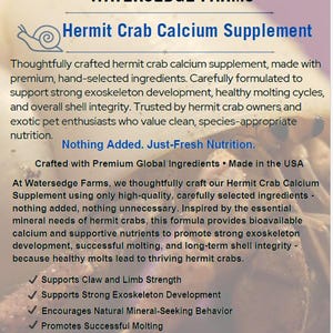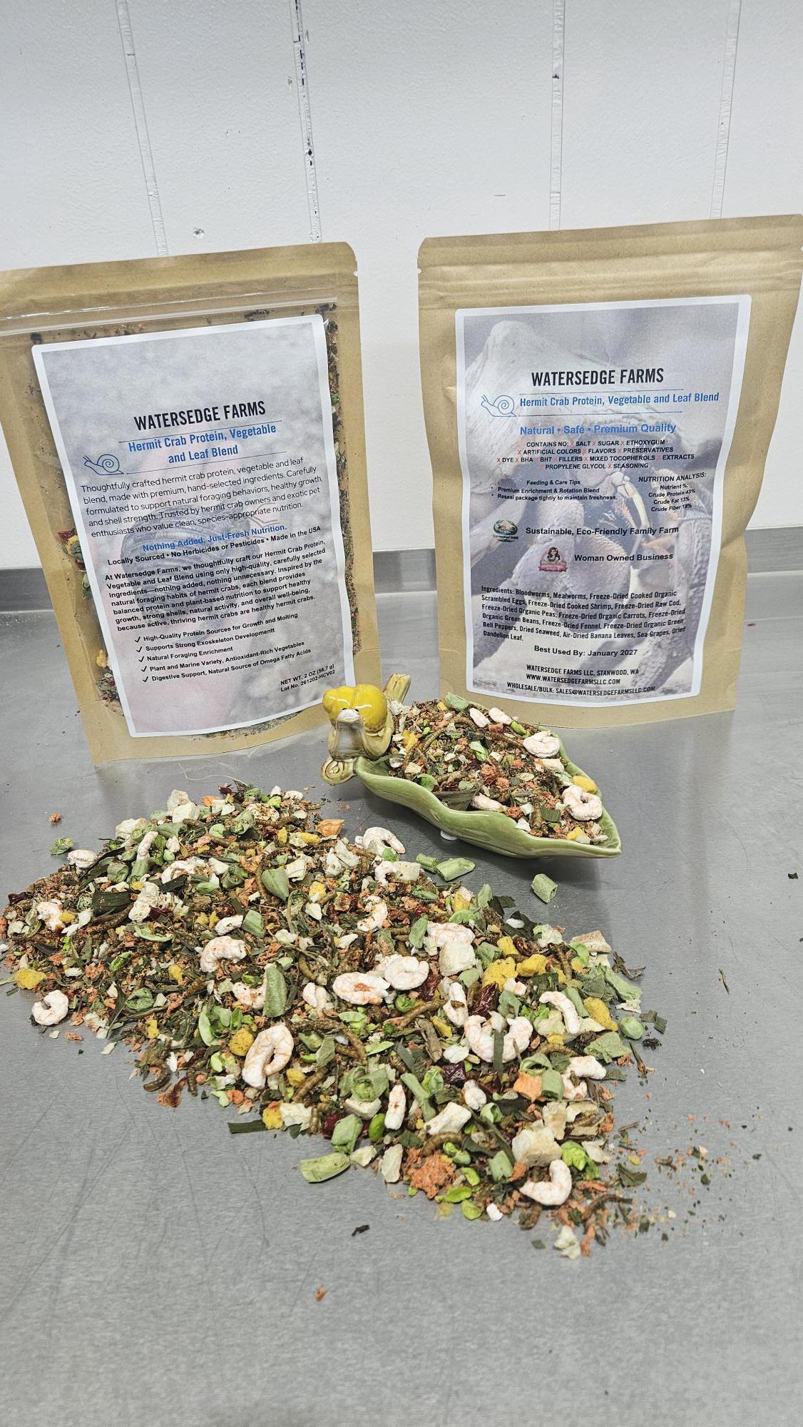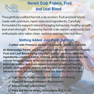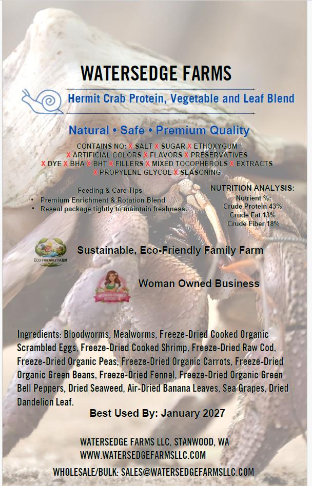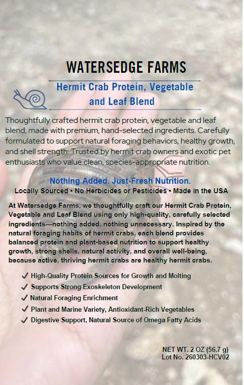 At Watersedge Farms, we thoughtfully craft our Hermit Crab Protein, Vegetable and Leaf Blend using only high-quality, carefully selected ingredients—nothing added, nothing unnecessary. Inspired by the natural foraging habits of hermit crabs, each blend provides balanced protein and plant-based nutrition to support healthy growth, strong shells, natural activity, and overall well-being, because active, thriving hermit crabs are healthy hermit crabs.