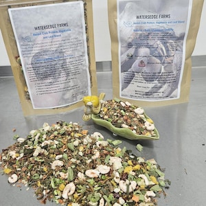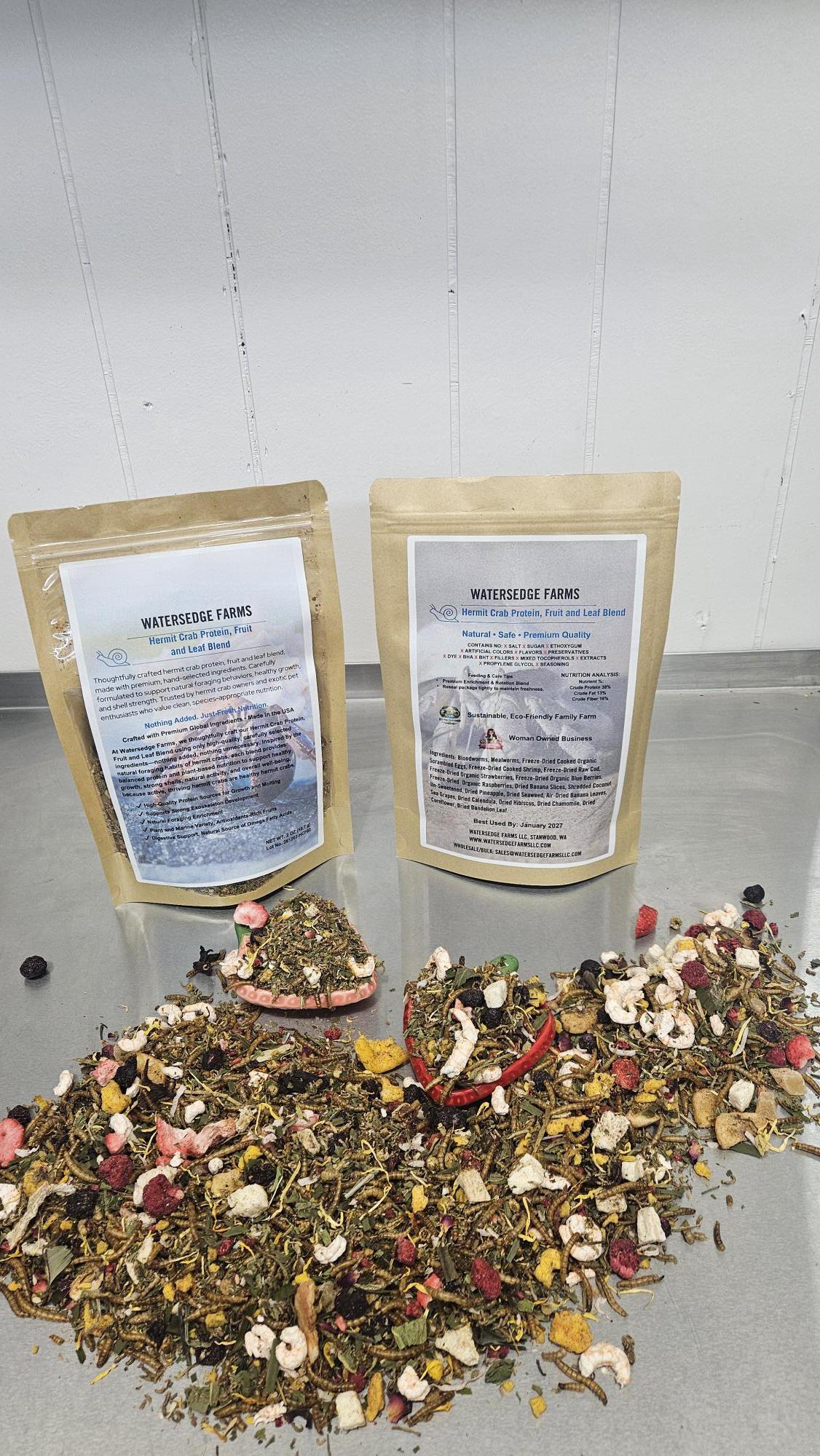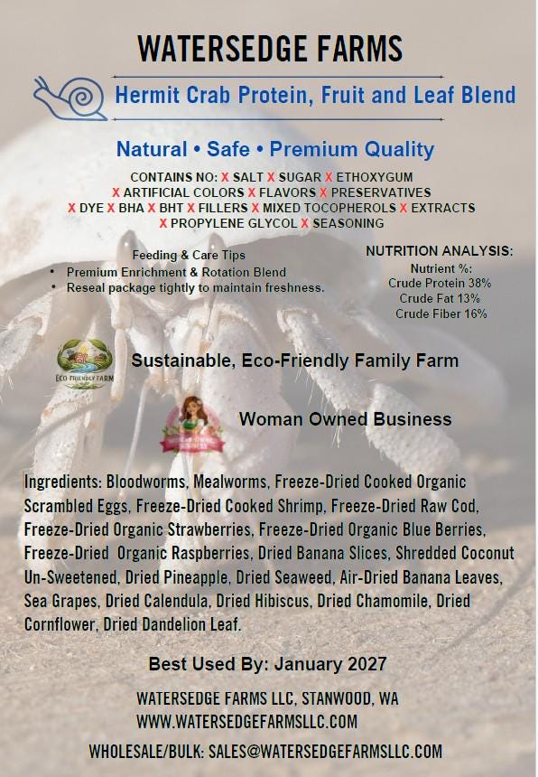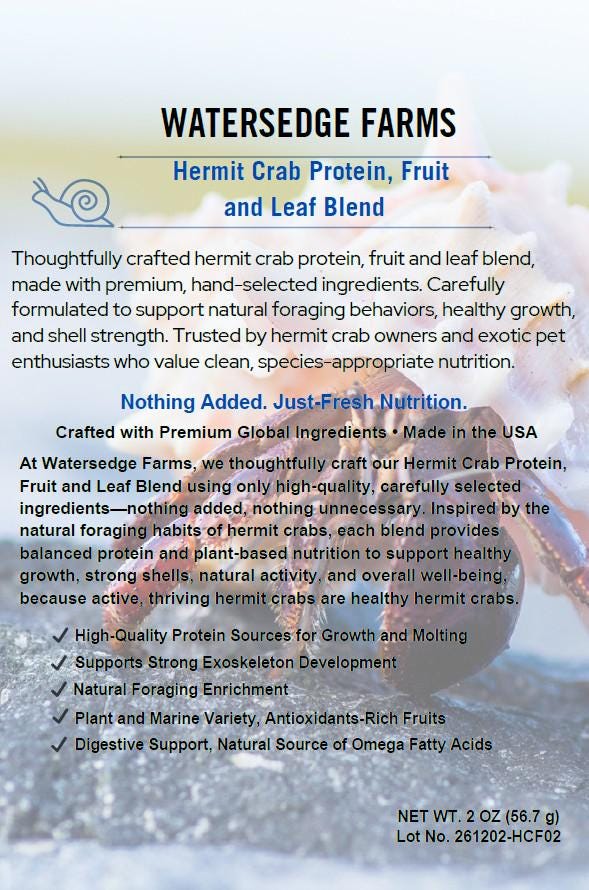 At Watersedge Farms, we thoughtfully craft our Hermit Crab Protein, Fruit and Leaf Blend using only high-quality, carefully selected ingredients—nothing added, nothing unnecessary. Inspired by the natural foraging habits of hermit crabs, each blend provides balanced protein and plant-based nutrition to support healthy growth, strong shells, natural activity, and overall well-being, because active, thriving hermit crabs are healthy hermit crabs.