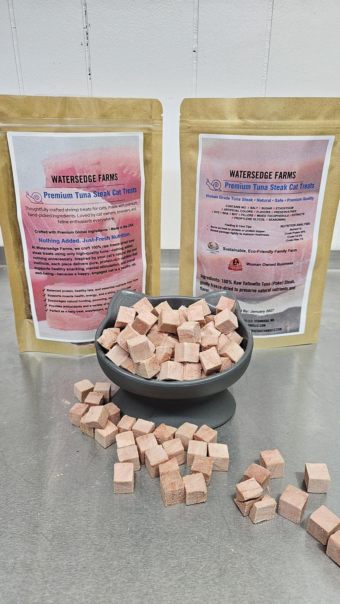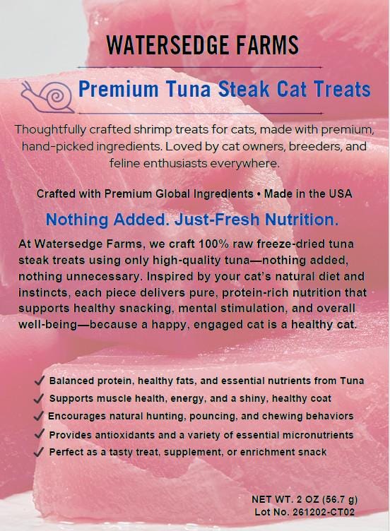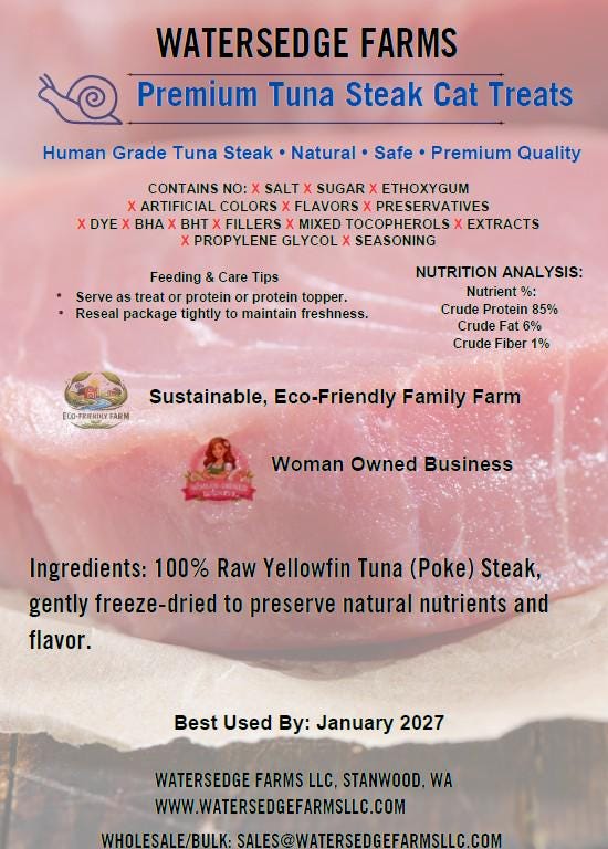 At Watersedge Farms, we thoughtfully combine hand-picked, high-quality raw tuna steak to create wholesome treats that support your cat’s natural diet and instincts. Each tuna steak treat encourages healthy snacking, mental stimulation, and overall well-being—because a happy, engaged cat is a healthy cat.