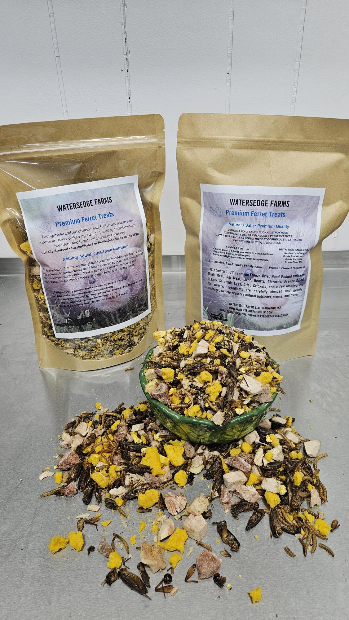 Thoughtfully crafted protein treats for ferrets, made with premium, hand-picked ingredients. Loved by ferret owners, breeders, and ferret enthusiasts everywhere. Locally sourced, women owned, no herbicides, no pesticides, sustainable, eco-friendly family farm, and made in the USA. Nothing added, just fresh nutrition.