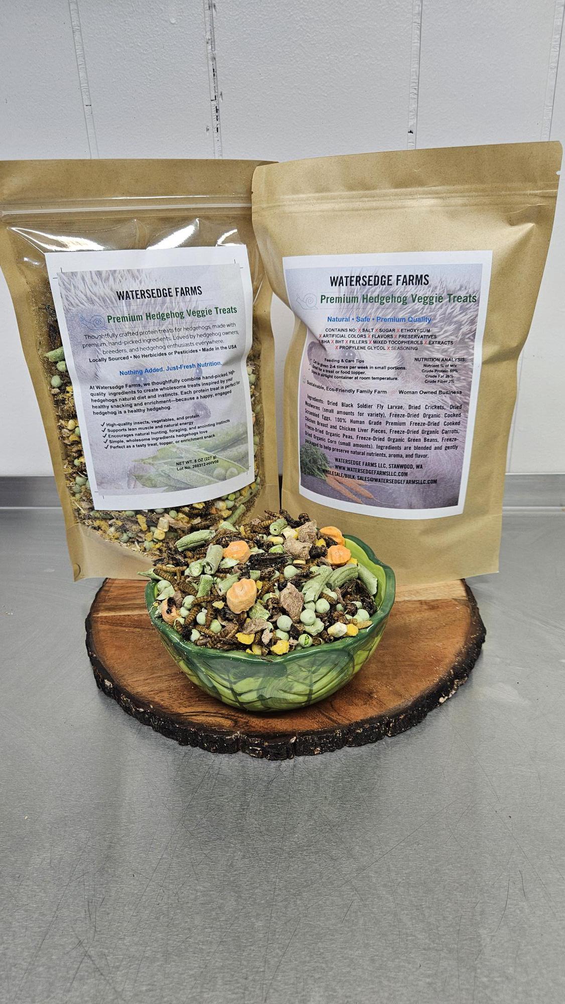 At Watersedge Farms, we thoughtfully combine hand-picked, high quality ingredients to create wholesome treats inspired by your hedgehogs natural diet and instincts. Each protein treat is perfect for healthy snacking and enrichment—because a happy, engaged hedgehog is a healthy hedgehog.