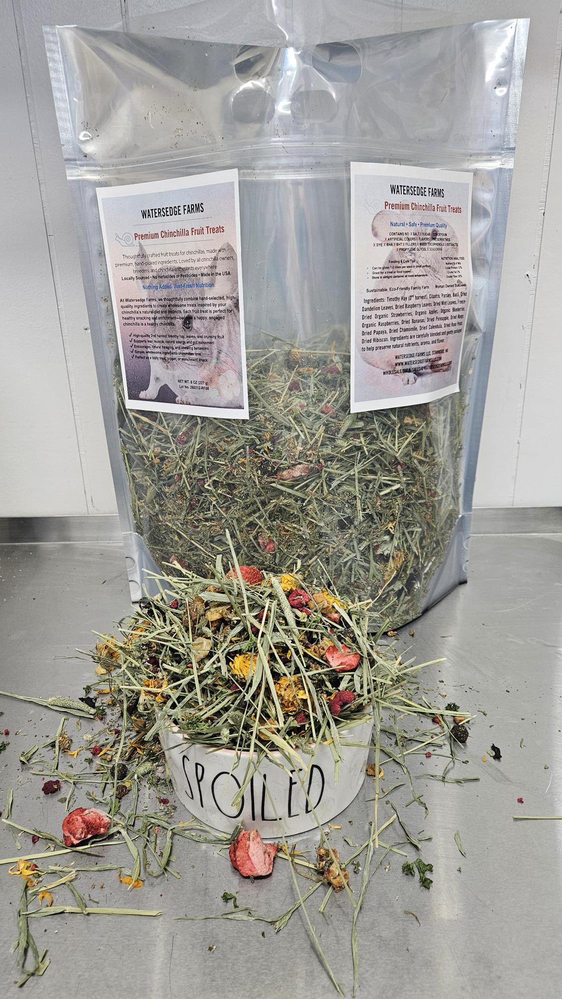 At Watersedge Farms, we thoughtfully combine hand-selected, high quality ingredients to create wholesome treats inspired by your chinchilla’s natural diet and instincts. Each fruit treat is perfect for healthy snacking and enrichment—because a happy, engaged chinchilla is a healthy chinchilla.