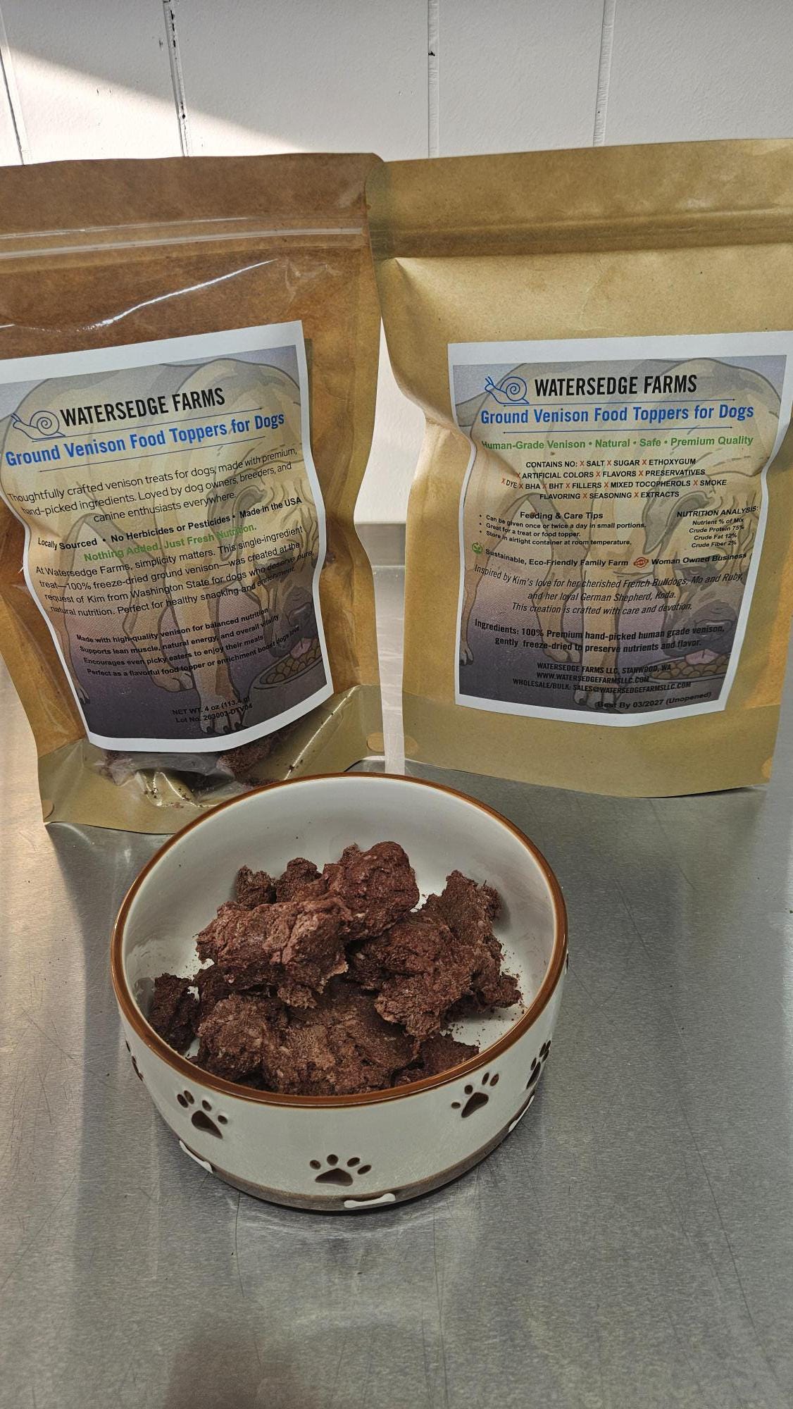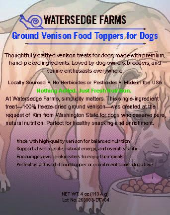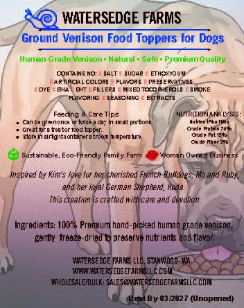 At Watersedge Farms, simplicity matters. This single-ingredient treat—100% freeze-dried ground venison—was created at the request of Kim from Washington State for dogs who deserve pure, natural nutrition. Perfect for healthy snacking and enrichment.