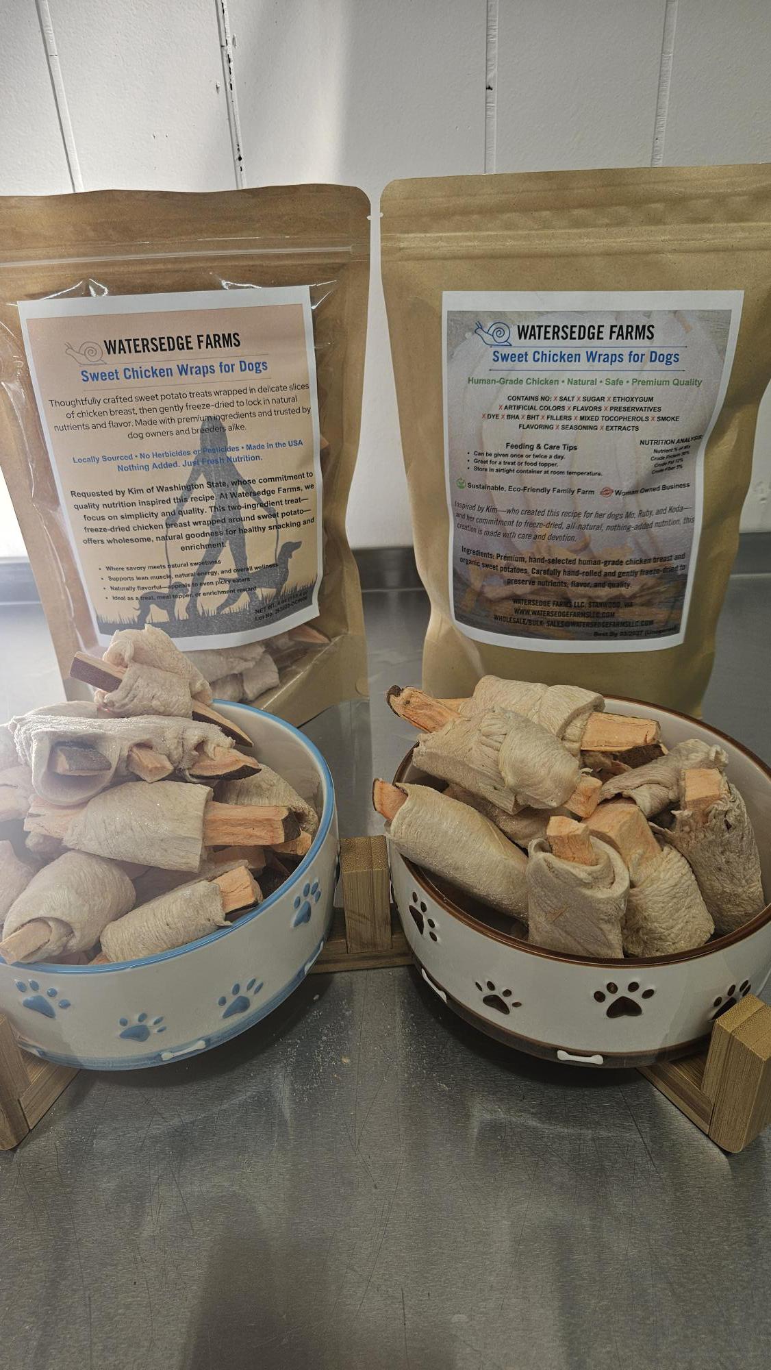 Requested by Kim of Washington State, whose commitment to quality nutrition inspired this recipe. At Watersedge Farms, we focus on simplicity and quality. This two-ingredient treat— freeze-dried chicken breast wrapped around sweet potato—offers wholesome, natural goodness for healthy snacking and enrichment.